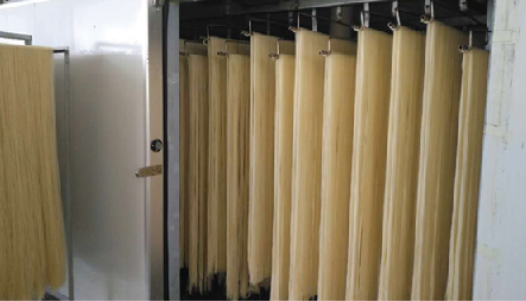 米粉的干燥工藝主要分自然晾曬干燥和烘烤干燥。老化后的米粉凝固較緊,因此在干燥前需用清水清洗,梳理整齊后放入烘烤架上烘烤。烘烤干燥要有專業(yè)的烘烤線,整個(gè)烘烤過程都在室內(nèi)進(jìn)行,并通過傳送帶流動烘干,烘烤間主要劃分成三個(gè)溫區(qū):低溫區(qū)、高溫區(qū)和冷卻區(qū)間。