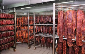 臘肉烘干機溫度保持在45至70℃(可按),溫度開始高,而后逐步降低,正確掌握烘房溫度是決定成品品質的關鍵。操作人員經經常檢查肉坯的干濕程度,如溫度過高,熱量大,則滴油過多,影響成品率。如溫度過低,則容易發生酸味而且色澤發暗,影響質量。烘焙時應分清級別,以防混淆。臘肉坯進烘房經14小時左右,視條坯干燥情況即可升至第 二層繼續烘焙。升層時里外竹竿相互調換位置,使條坯受溫均勻,再經24小時左右即可出房。